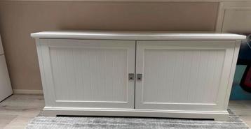Mooi wit tv-meubel met twee deuren, ideaal voor het opbergen van media-apparatuur en andere spullen. Het meubel is gebruikt, maar verkeert nog in goede staat en kan een mooie toevoeging zijn aan uw wo