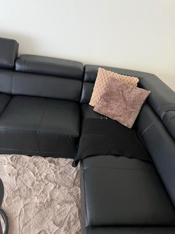 Mooie zwarte hoekbank te koop. Eén zitplek is beschadigd en moet mogelijk gerepareerd worden. De overige zitplaatsen zijn in goede staat, niet ingezakt of doorgezeten. De leuningen zijn verstelbaar (o