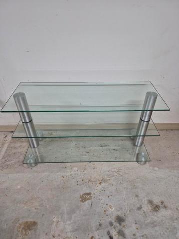 Modern tv-meubel met drie glazen platen en stevige metalen poten. De tafel heeft rollen zodat je deze eenvoudig kan verplaatsen. Ideaal voor uw televisie en media-apparatuur. Het meubel is in goede st