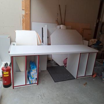 Diverse meubilair, waaronder een groot bureau en losse kasten, in wit met een opvallende rode rand. Ideaal voor een kantoor, hobbyruimte of als extra opbergruimte. Het meubilair is gebruikt maar nog i