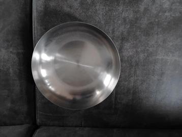 Schaal heeft een doorsnede van 23 cm. Is van rvs en heeft hier dienst gedaan als fruitschaal. Wil hem geven aan iemand die opnieuw moet beginnen of niet veel te besteden heeft.
