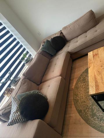 Mooie en comfortabele hoekbank, perfect voor een groter gezin. De afmetingen zijn te vinden op de tweede foto (300cm x 215cm). De bank is gebruikt en heeft enkele vlekken van peuter kindertijd (melkfl