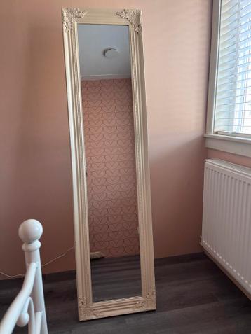 Gratis op te halen!! Mooie crèmekleurige staande spiegel met een sierlijke lijst. De spiegel is 167 cm hoog en staat 44 cm diep wanneer uitgeklapt. Perfect voor in de slaapkamer, hal of woonkamer om e