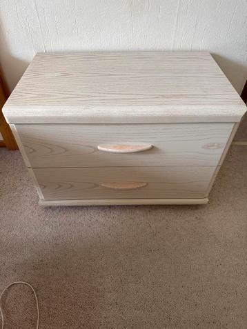 Net nachtkastje met twee ruime lades. Ideaal voor naast het bed om spullen in op te bergen. De afmeting is 63x40 cm. Kan nog prima een ronde mee