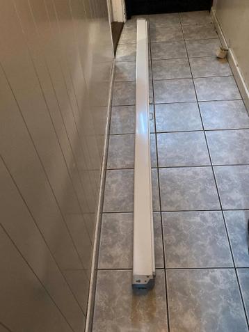 Projectiescherm van 240 cm breed x 180 cm hoog in rolcassette; zonder schroeven; handgreepje (foto 3) zit los; trek het scherm aan de rand omlaag.