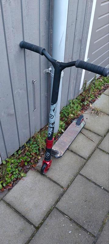 Gebruikte stuntstep. Ideaal voor beginners. Gebruikssporen aanwezig, maar nog in goede staat om mee te stunten.