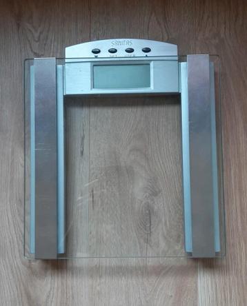 Sanitas digitale personenweegschaal, met een modern design van glas en zilverkleurige accenten, meet ook vetpercentage, spier en water. De weegschaal is gebruikt, heeft normale gebruikssporen, maar ve