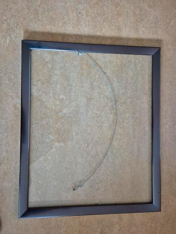 Fotolijst, hout, kleur grijs metaalachtig. 64X53cm. Lijstbreedte 3 cm, lijstdikte 2 cm. Licht beschadigd zie foto. Cpl met glas en achterzijde en ophangkabeltje.