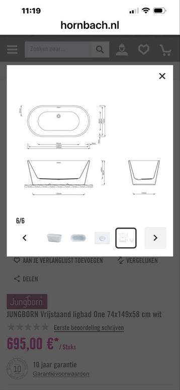 Vrijstaand ligbad van jungborn, model one. Afmetingen 74x149x58 cm. Het bad is wit en heeft een beschadiging aan de de onderzijde door transport, is buiten het zicht en maakt voor de constructie van h