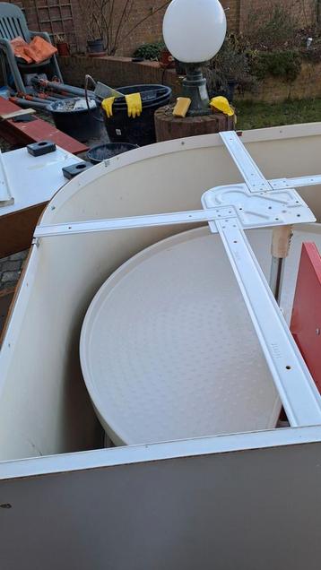 Een hoek draaikast het mechanisme is nog prima, kan zo ingebouwd worden. Inclusief 2 mdf gelakte deurtjes (zonde de handvaten). Merk ninka. Inbouw ongeveer 56 cm straal van de draaischijf is ongeveer