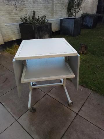 Klaptafeltje, verrijdbaar. Bovenblad 50x50 cm. Zijbladen elk 40x50 cm. Uitgeklapt 140x50 cm. Hoogte 76 cm.
