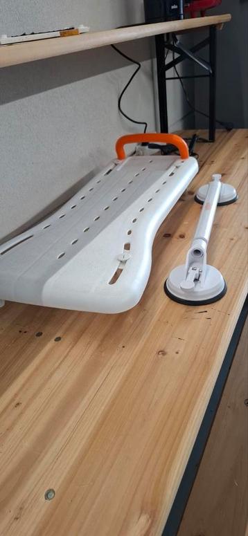 Badplank met zuignappen β€” vaak gebruikt als badzitje / badtransfer plank. πŸ› Het bestaat uit: de plank: een badplank of badzitplank (je zit of schuift erop om makkelijker in bad te komen). De stangen
