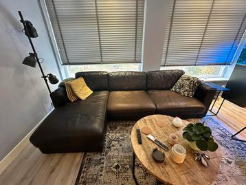 Comfortabele en ruime donkerbruine leren hoekbank, ideaal voor een gezellige zithoek. De bank is gebruikt maar verkeert nog in goede staat en biedt voldoende plaats voor meerdere personen. Het leer he