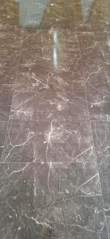 Mooie donkergrijze vloertegels met een elegante marmerlook. Deze tegels zijn gebruikt, maar verkeren nog in goede staat en zijn perfect voor het creëren van een stijlvolle vloer in diverse ruimtes. De