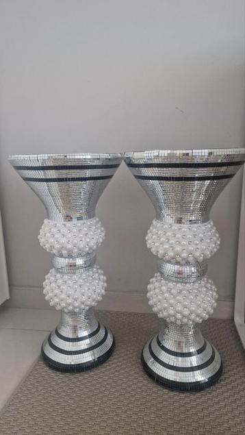 Set van twee prachtige plantenstandaards/zuilen, volledig bekleed met spiegelmozaïek en versierd met elegante parels. Ze zijn in goede staat, maar missen op 2 plekken enkele mozaiekjes.