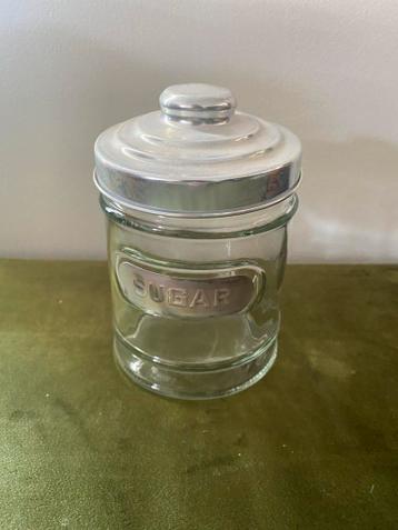 Mooie glazen suikerpot met een stevig metalen deksel. Op de voorkant staat 'sugar' in reliëf, wat het een klassieke uitstraling geeft. Ideaal voor het bewaren van suiker, maar ook geschikt voo