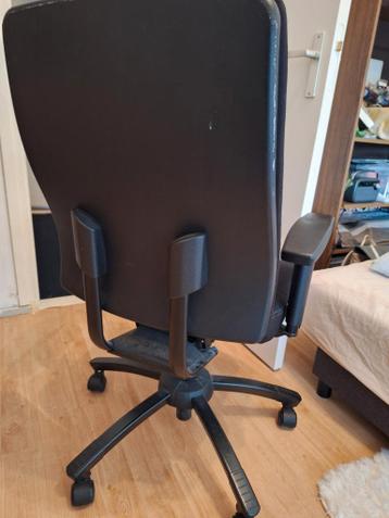 Comfortabele zwarte bureaustoel, ideaal voor thuiswerk of op kantoor. De stoel is in hoogte verstelbaar en voorzien van armleuningen voor extra comfort. Er zijn lichte gebruikerssporen aanwezig, maar