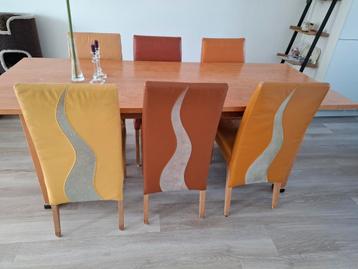Eettafel met 6 stoelen (leer) (6 verschillende kleuren) gratis af te halen. Is gebruikt maar kan nog prima een ronde mee. Lengte tafel is 2,20 m. Graag zsm ophalen.