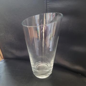 Mooie glazen vaas met een schuine opening. De vaas heeft een kleine chip aan de rand, zoals te zien op de foto's. Ideaal voor bloemen of als decoratief object.