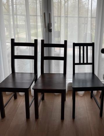 Set van drie donkergebeitste houten stoelen. Twee van de stoelen zijn stevig en in goede staat. De meest linker stoel wiebelt en heeft wat lijm nodig om weer stabiel te zijn. Ideaal voor de eetkamer o