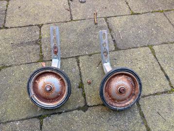 Set van twee gebruikte zijwieltjes. Ze zijn wat roestig, maar functioneren nog prima om een kind te helpen leren fietsen.