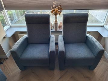 Gratis af te halen stoelen. 2 Stuks. Donker antraciet tegen zwart aan. Gebruikerssporen aanwezig. Lxbxh 75x80x102 zitdiepte 52