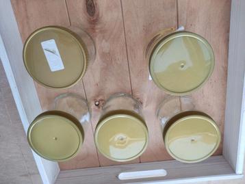 Deze set bestaat uit 5 lege honingglazen, elk voorzien van een bijpassend goudkleurig deksel. Ideaal voor het bewaren van zelfgemaakte honing, jam, kruiden of andere kleine etenswaren. De glazen zijn