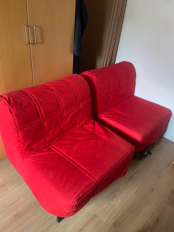 Twee comfortabele eenpersoons slaapbanken in een rode kleur. Perfect voor kleine ruimtes of als extra slaapplek voor logees. Ze zijn eenvoudig uit te klappen en bieden een comfortabele zit- en slaaper