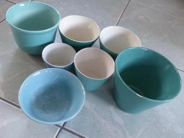 7 bloempotten, blauw-groen, uit de jaren `70 gratis af te halen