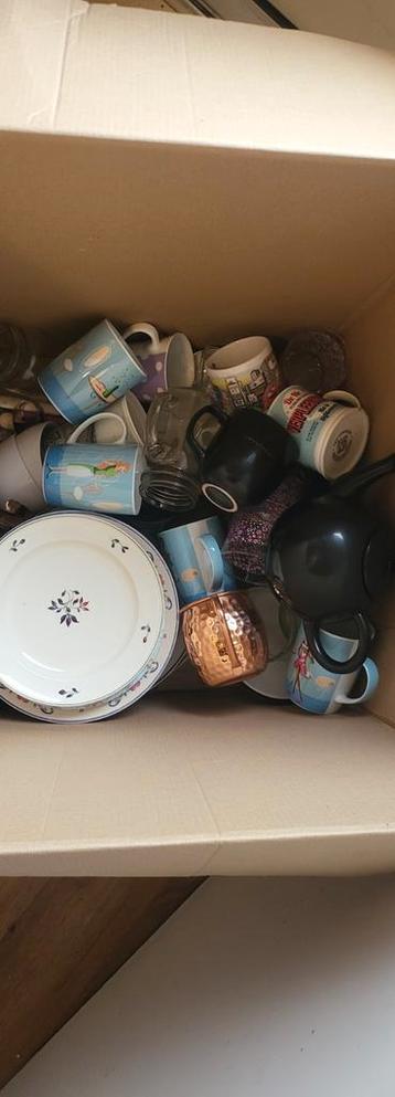 Een gevarieerde collectie van serviesonderdelen, waaronder borden, koppen, glazen en andere items. Ideaal voor wie op zoek is naar aanvulling op een bestaand servies of een eclectische mix wil creëren