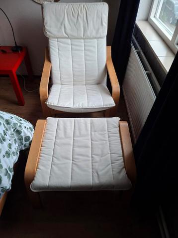Comfortabele ikea poäng fauteuil met bijpassende voetenbank. De stoel heeft een licht houten frame en witte kussens. Ideaal voor ontspanning in de woonkamer of leeshoek. De kussens zijn afneembaar en