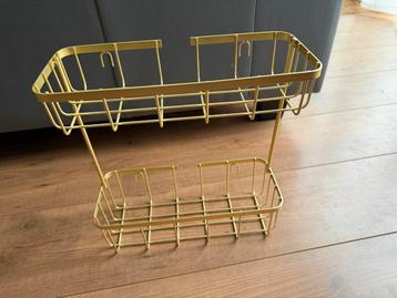 Mooi goudkleurig rekje met twee lagen, ideaal om op te hangen in de badkamer voor het opbergen van bijvoorbeeld shampoo, douchegel of andere badkamerbenodigdheden. Het rekje is in goede staat en voegt