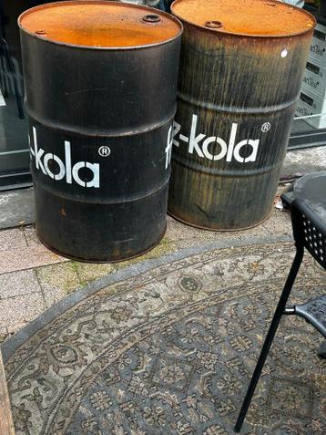 Twee decoratieve fritz-kola tonnen, ideaal voor een industriële look in uw tuin, terras of als uniek interieurstuk. De tonnen zijn gebruikt en vertonen roest en slijtage, wat bijdraagt aan hun karakte