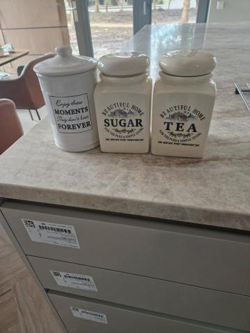 Mooie set van drie keramische voorraadpotten. Twee potten zijn gelabeld voor suiker en thee, de derde pot heeft de tekst "enjoy these moments they don't last forever". Perfect voor het b
