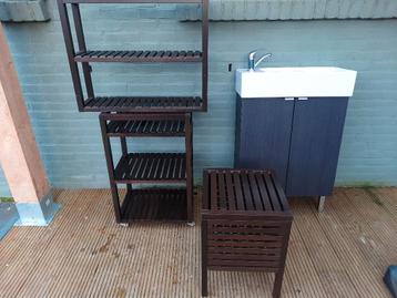 Leuke badkamerset, wastafeltje met meubel,wandrek, opbergtrolley, poef/opbergkruk.