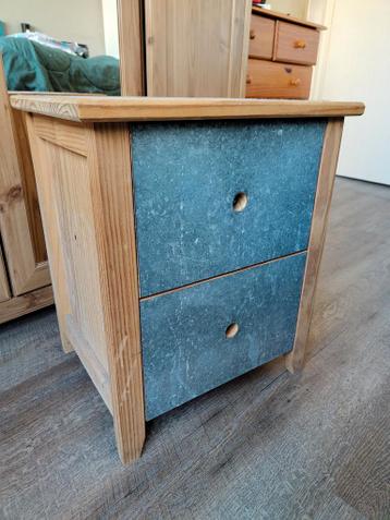 Dit is een houten bijzetkastje of nachtkastje met twee lades.