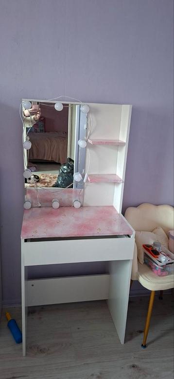 Mooie kaptafel met een spiegel en ingebouwde verlichting. Ideaal voor make-up en haarstyling. De tafel heeft een lade voor opbergruimte en twee kleine plankjes aan de zijkant van de spiegel. Het blad
