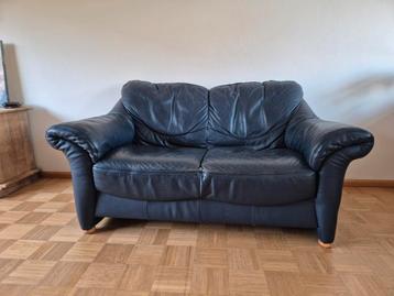 Comfortabele donkerblauwe lederen bank te koop. De bank heeft wat slijtageplekken, zoals te zien op de foto's, maar zit nog uitstekend en kan zeker nog een ronde mee. Ideaal voor een studentenkame