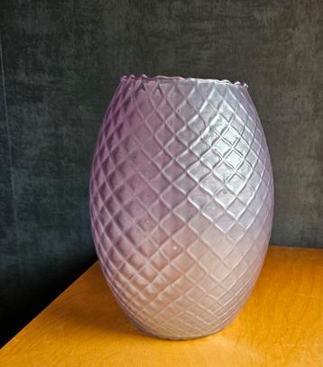 Deze paarse vaas heeft een ruitjespatroon over de hele buitenkant. De bovenrand is golvend. De vaas is gratis af te halen.