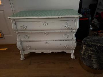 Buikkast met drie lades. De kast is 72 cm hoog, 43 cm diep en 90 cm breed. De bovenkant heeft een groen met wit stippenpatroon. De kast heeft wat beschadigingen aan de verf en is een opknapper.