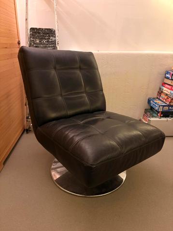 Comfortabele en stijlvolle, zwarte leren draaistoel. De stoel staat op een stevige draaischijf van metaal. Ideaal voor in de woonkamer, studeerkamer of als extra zitplek. Het leer is in goede staat en