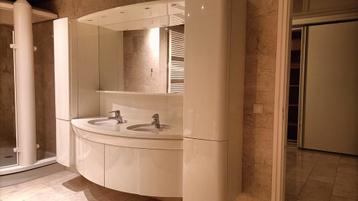 Dit wastafelmeubel heeft twee wasbakken en een grote spiegel met verlichting. Aan beide zijkanten zit een hoge kast. De kranen zijn inbegrepen. Zelf demonteren in lobith