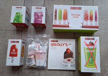 Voor de zoku quick pop maker (ijsjesmaker; zie de laatste 2 foto's) de volgende accessoires: - 2x ice pop mold (schildpad en uil) - storage case - 2x 6 sticks & 6 drip guards - receptenboek :