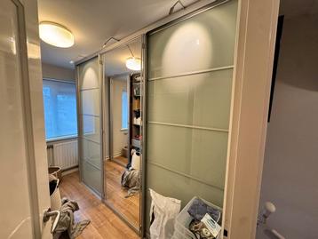 Fijne inbouwkast met drie schuifdeuren waarvan één spiegel deur. Totale breedte van de gehele kast is ca 270cm, hoogte 235. Op maat laten maken een aantal jaar geleden maar in verband met een andere b