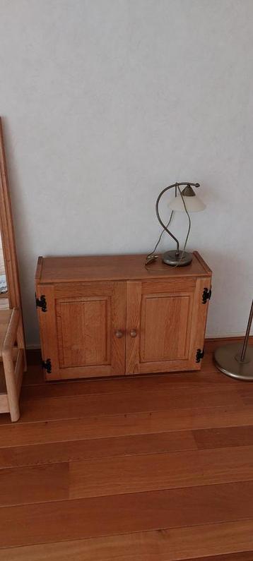 Mooi en stevig eikenhouten kastje met twee deuren en rustieke scharnieren. Ideaal voor extra opbergruimte in de woonkamer, hal of slaapkamer. Het kastje is in goede staat en heeft een warme uitstralin