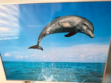 Dit is een poster van een dolfijn die uit het water springt. Het glas rechtsonder is gebroken. De poster zit in een zilverkleurige lijst. 60X80