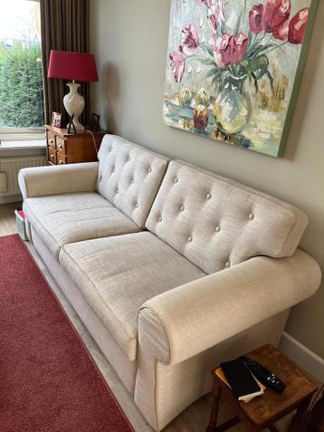 Set bestaande uit een driezitsbank en twee fauteuils met een bloemenprint. De bank is 210 cm lang, 45 cm hoog en heeft een zitdiepte van 56 cm. De leuning is 90 cm hoog. De kleine stoel is 76 cm breed