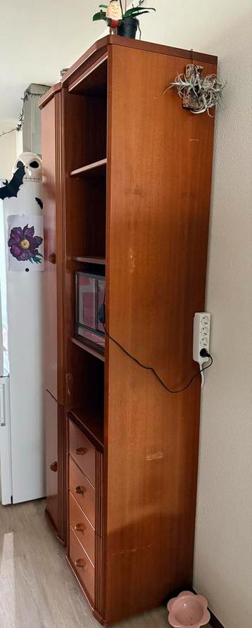 Complete houten meubelset bestaande uit twee hoge kasten en één lage kast. Eén van de hoge kasten heeft een schuine kant, ideaal voor een hoekopstelling. De lage kast is voorzien van een handige val d