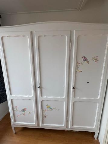 Prachtige, handgeschilderde kledingkast met een charmant vogelmotief. Deze kast is een echte eyecatcher en biedt voldoende opbergruimte met zowel planken als hangruimte. De binnenkant is lichtroze gev