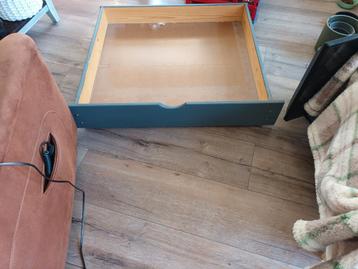 Een bedlade van 18,5 cm hoog, 99 cm breed en 83 cm diep. De lade is grijs van buiten en heeft een houten binnenkant. Handig voor extra opbergruimte onder een bed. Ophalen in driebergen.